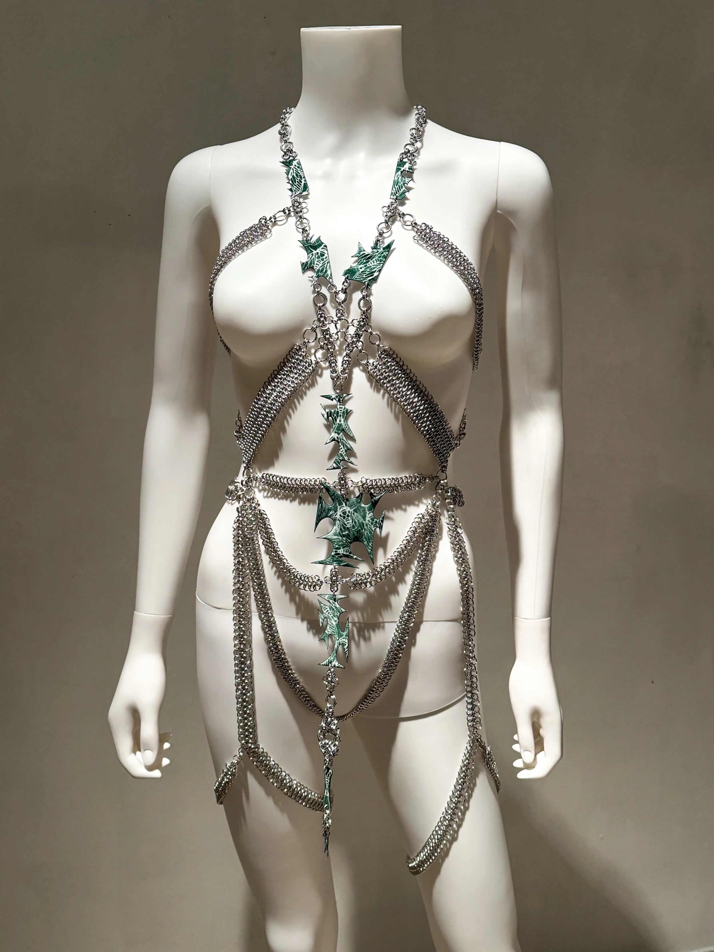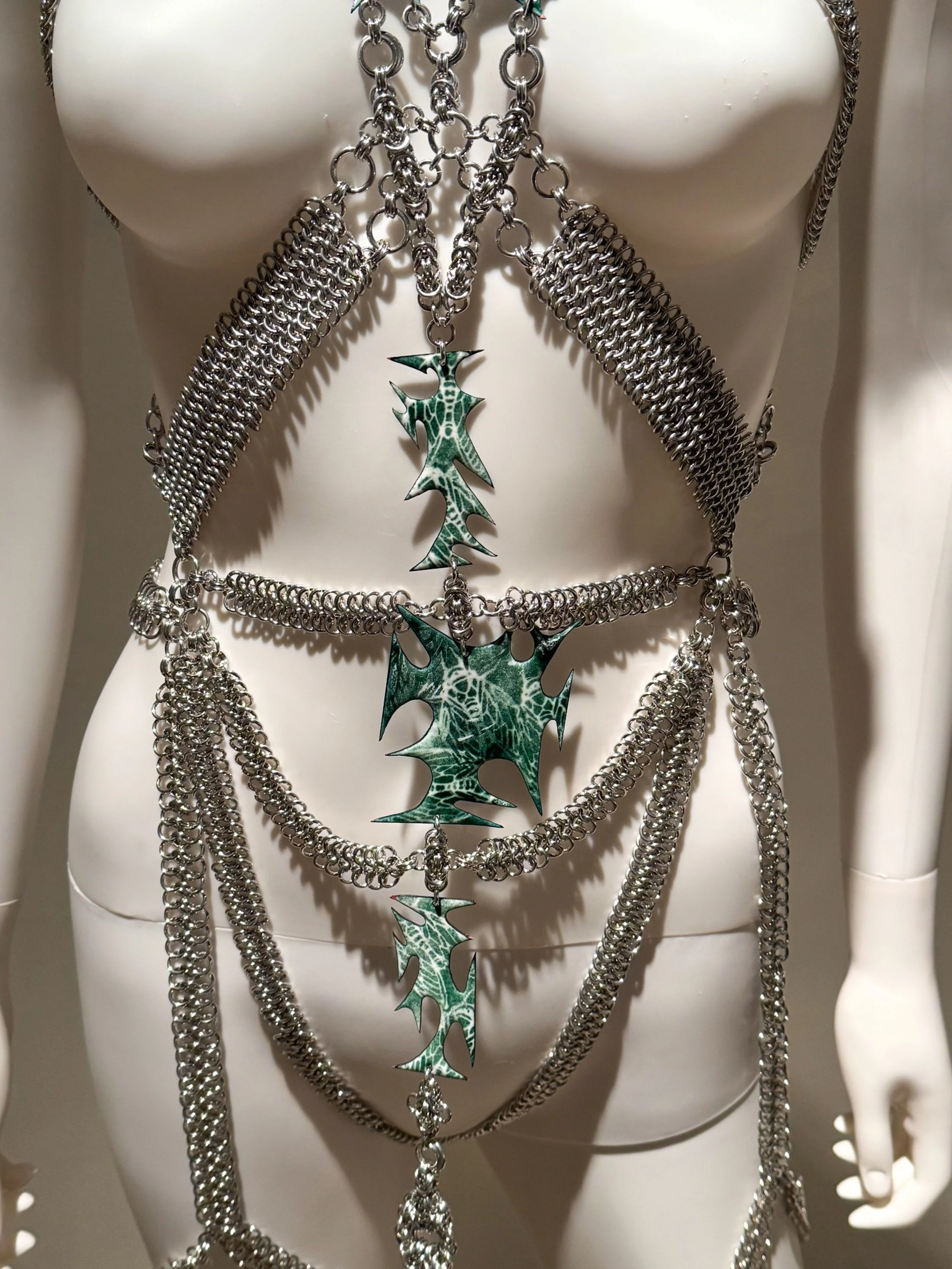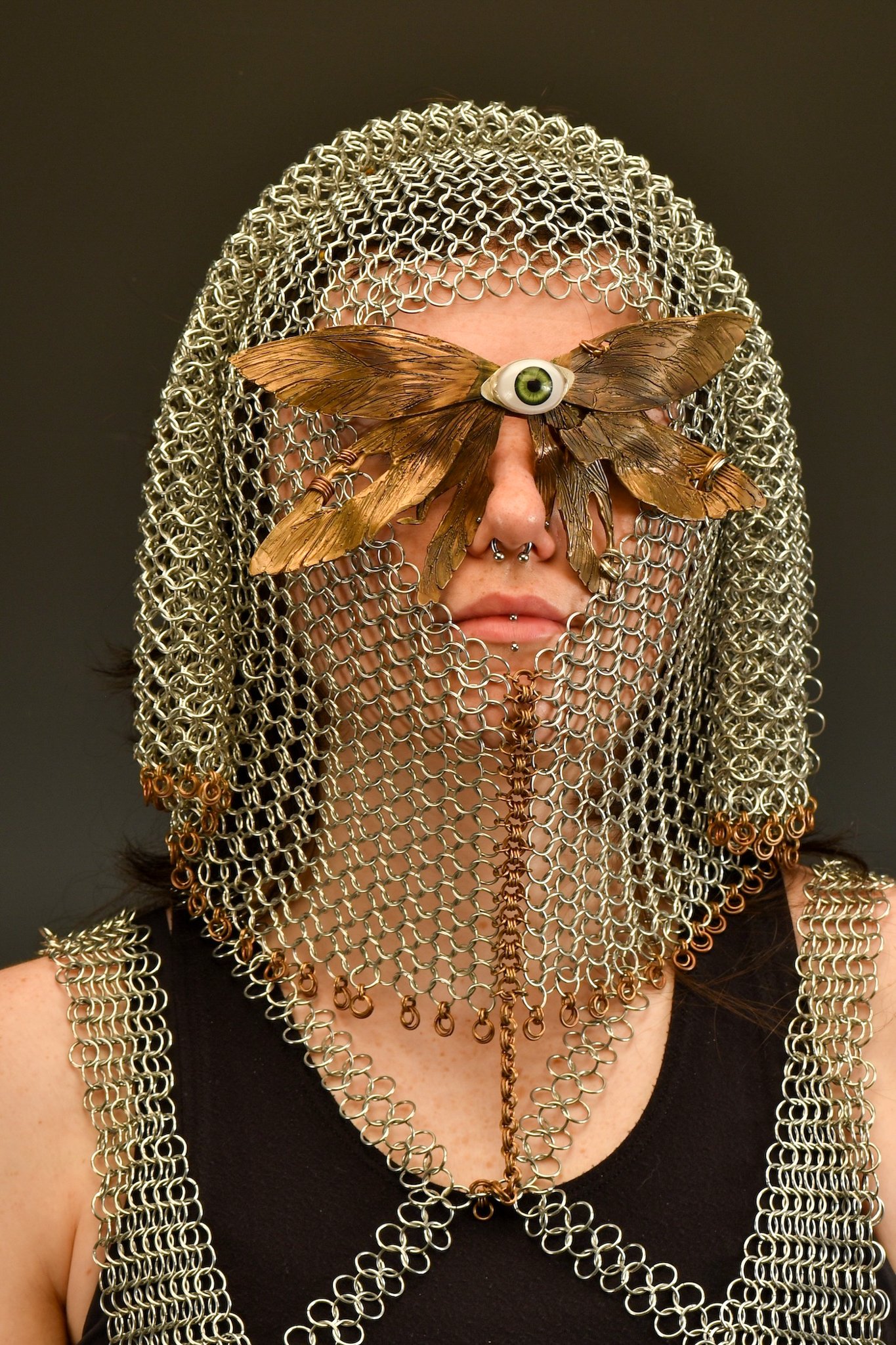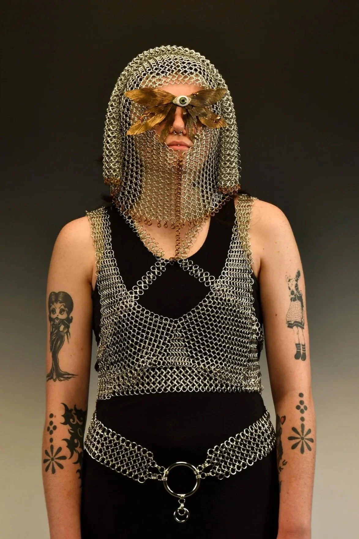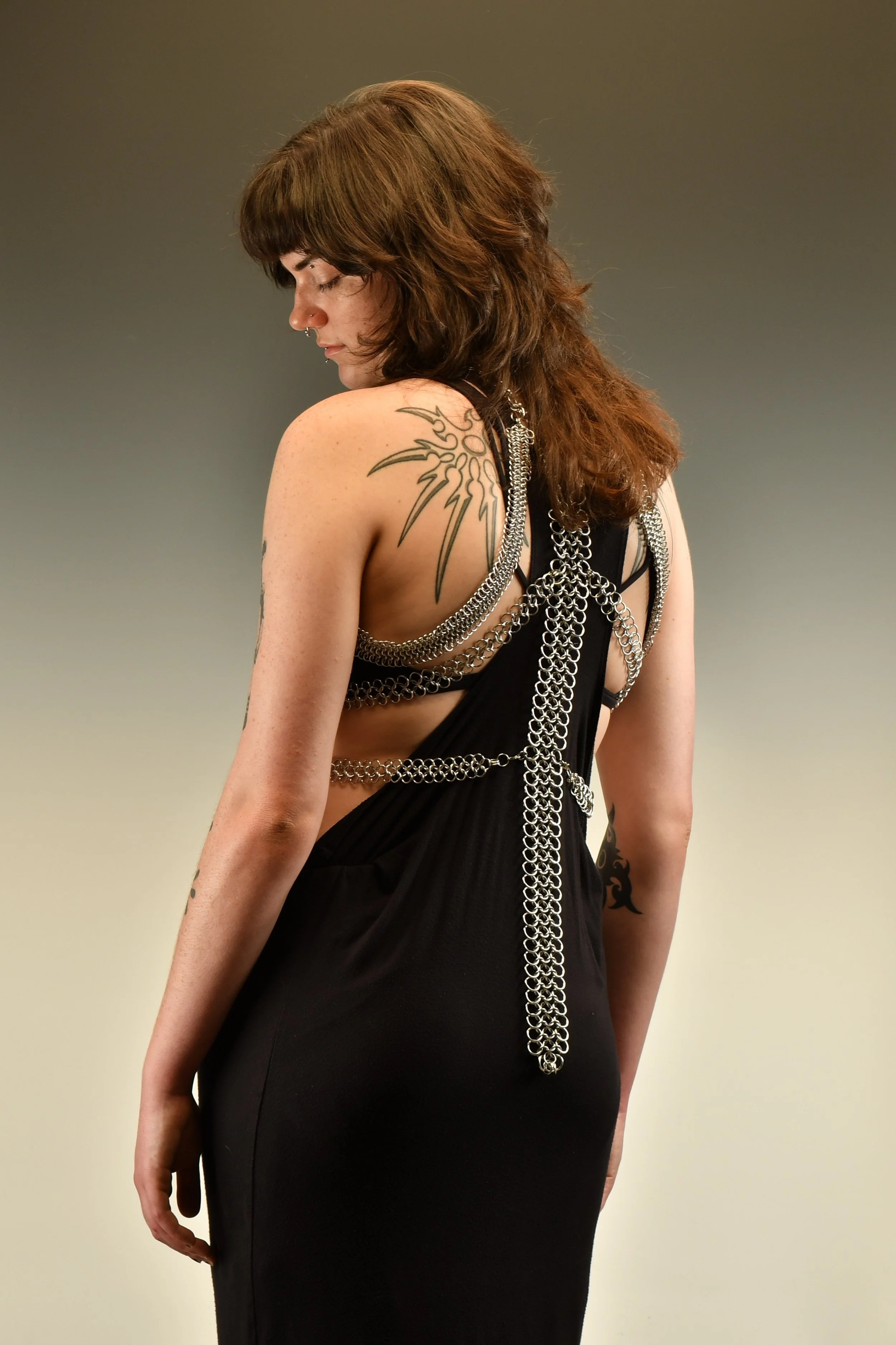 My recent work has been exploring the relationship between metal adornment and textiles, and the intimacy that they share with the wearer through the use of chainmail. The chainmail displays how clothing and jewelry are used as self expression, but also as a layer of protection. This contemporary use of chainmail disrupts the historical concept of what chainmail can signify and be used for.